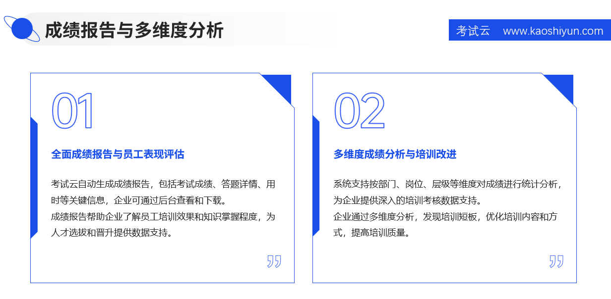 当员工完成考试后,考试云在线培训考试系统会自动生成成绩报告,包括考试成绩、答题详情、用时等关键信息。企业可以通过系统后台查看和下载成绩报告,对员工的考试表现进行全面分析。